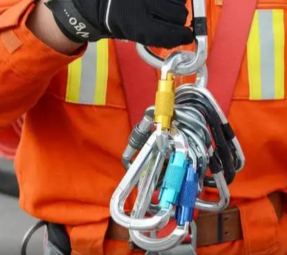 安全钩(carabiner),也叫“主锁”,分普通式(旋转式)和弹簧钩(自锁式)两种。消防轻型安全钩主要材质为铝镁合金,消防通用安全钩主要材质为不锈钢。