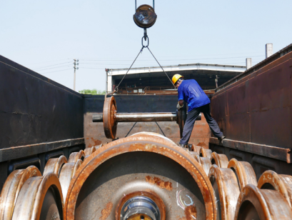 在露天轨道线上停靠着多辆铁皮敞车车厢,而车轮车间的搬运工人则需要将车轴、轮饼和轮对进行卸车作业,他们用来吊运轮对的起重吊装设备是行车,正式吊运时,由一人负责操控行车,熟练地运作吊钩,使其上下吊运,而站立在货车车厢上的司机则负责使用安全钩和其他的吊索具将一条超过1吨重的轮对稳稳吊起。