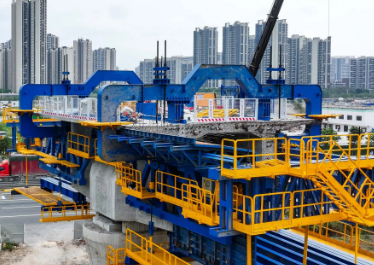 这台智慧造桥机宛如一个钢铁巨兽,呈半 “T” 型结构,虽净重 75.7 吨,却行动灵活且功能强大。它由承重杆件、液压整体模板、液压调节、自动走行、信息化监控、平台防护等多个系统协同组成。在施工时,顶部作业平台宛如一个忙碌的空中工厂,钢筋绑扎、混凝土浇筑、蒸汽养护、自动喷淋等工序有序开展;机身周围的安全通道,则为工人的作业安全提供了坚实保障。随着施工推进,它还能自动前行,精准完成一段又一段梁体的建造,直至桥体完美合龙。